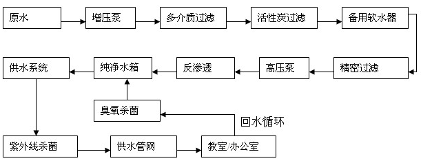 在學(xué)校安裝一套足夠容量的智能直飲水主機(jī)(包括原水箱、純水箱、多級組泵、活性炭等多級過濾器、紫外線滅菌系統(tǒng)等),生產(chǎn)制造出健康活性直飲水,然后經(jīng)由恒壓滅菌機(jī)通過封閉管網(wǎng)(PP-R食品管材)輸送至教室各飲水終端,隨取隨飲。中小學(xué)活動(dòng)場地主要以教室為主,飲水終端主要放在人群集中的教室或者走廊以方便學(xué)生隨時(shí)飲水,而達(dá)到效益最大